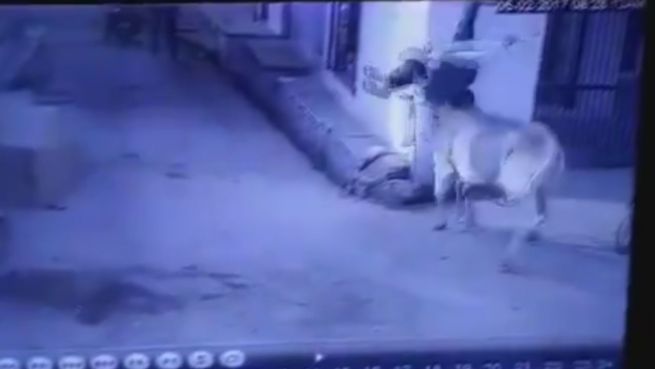 Folgenschwere Stierattacke im nordindischen Shivpuri. Eine Überwachungskamera zeigt, wie ein Mann von hinten in die Luft geschleudert wird und hart auf die Straße schlägt. Er zog sich dabei schwere Verletzungen zu.