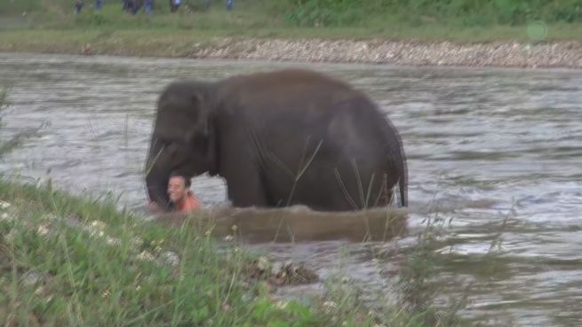 Elefant Kham Lha sieht, dass sein Betreuer Darrick in Not ist. Er springt sofort in den Fluss und will helfen. Doch der braucht gar keine Hilfe, sondern strahlt.