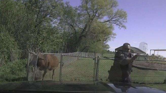 Ein Bulle hatte sich im US-amerikanischen Texas auf ein Sportgelände verirrt. Ein Streifenpolizist probiert sich als Kuhhirte und treibt das Vieh zurück in sein Gehege. Doch der Bulle dreht den Spieß im passenden Moment einfach um.
