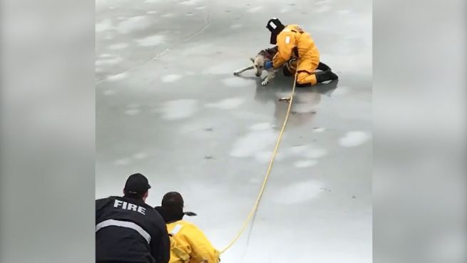 Dramatische Bilder aus Kanada. Ein unvorsichtiger Hund bricht in einem zugefrorenen Fluss ein und kämpft verzweifelt um sein Leben. Ein Feuerwehrmann kommt zur Hilfe und riskiert daraufhin sein Leben.