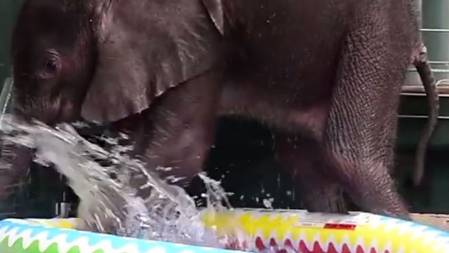 Bei den warmen Temperaturen, freut sich jeder über eine kühle Abwechslung. Auch im Zoo Dallas geht es für ein Elefantenbaby ins Mini-Planschbecken. Doch der kleine Dickhäuter ist noch etwas unbeholfen.