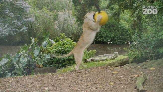 Dass nicht nur Stubentiger das Spielen mit Bällen lieben, beweist diese Löwin im Zoo von Auckland. Genussvoll jagt sie den Fellball, den die Pfleger für sie aufgehängt haben. Das ist nicht nur niedlich, sondern soll fit halten.