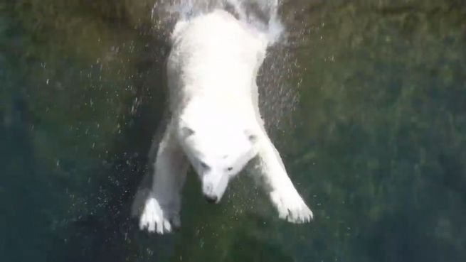 Was macht ein Eisbär, wenn es wärmer wird? Im Zoo von Oregon übt Eisbärin Nora den perfekten Bauchplatscher. Das sieht nach Spaß aus!