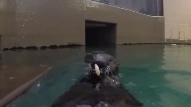 Otter Lincoln frisst zum ersten Mal wie ein ausgewachsener Otter und scheint sich dabei ausgiebig über sein erstes Festmahl zu freuen. Die Garnele scheint ihm jedenfalls gut zu schmecken. Guten Appetit, Lincoln!