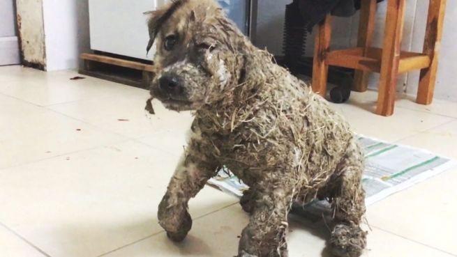Hund Pascal wurde von Kindern zum Spaß in Kleber getaucht. Nur mit Mühe konnten die Ärzte der nichtstaatlichen türkischen Organisation 'He'Art of Rescue' Pascal von seinem zementartigen Pelz befreien.