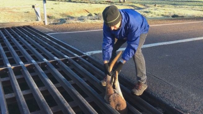 Mitten auf der Straße ragen im australischen Busch zwei Beine aus dem Boden. Sie gehören einem Känguru, das in einem Bodenrost fest steckt. Zum Glück können diese Menschen es befreien.