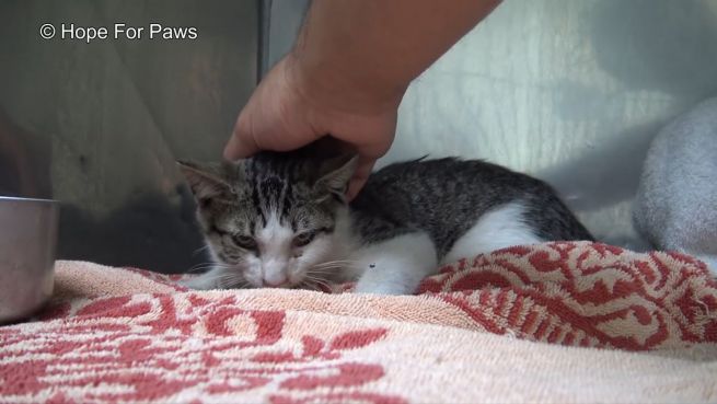 Ein junger Straßenkater wird in einer spektakulären Rettungsaktion von "Hope for Paws" gerettet. Das Tier war mit dem Kopf in einem Glaskrug stecken geblieben.