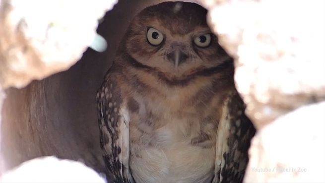 Alle kennen das Spiel aus ihrer Kindheit. Zwei Menschen gucken sich in die Augen, wer zuerst blinzelt, verliert. Dieser Kaninchenkauz aus dem Zoo von Phoenix geht als Favorit in jedes Rennen.