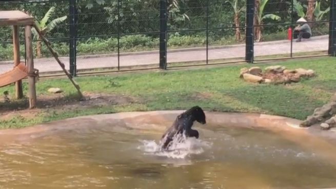 Dieser Bär wurde aus der Gefangenschaft einer Galle-Farm befreit, wo er eine schreckliche Behandlung erdulden musste. Eine Tierschutzorganisation befreite das Tier und päppelte es wieder auf. Auch die Lebensfreude hat der hydrophile Bär offensichtlich wieder gewonnen.