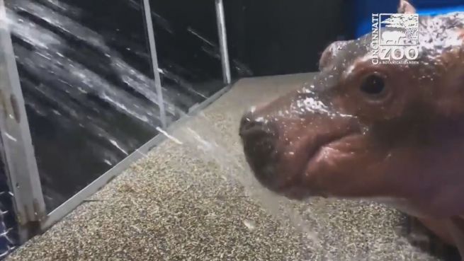 Im Zoo in Cincinnati entdeckt Nilpferdbaby Fiona zum ersten Mal, wieviel Spaß man mit einem Wasserschlauch haben kann. Die Kleine ist sich nur noch nicht sicher, ob sie trinken oder spielen will.