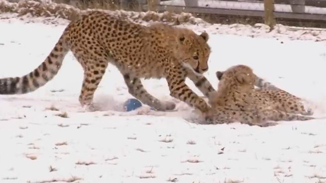 Die Geparden-Jungtiere Willow, Cathryn und Donni sind begeistert vom Schnee. Im Cincinnati Zoo tollen sie das erste Mal in ihrem jungen Leben durch die unbekannte weiße Pracht.
