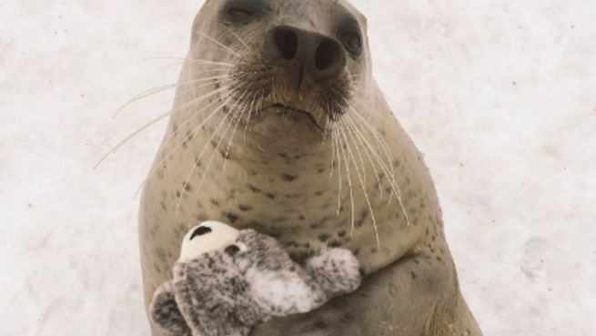 Diese Robbe im japanische Tierpark 'Mombetsu Land' hat einen besonderen Freund. Sie knuddelt mit Vorliebe eine Kuscheltier-Robbe und wird damit zum Twitter-Star.