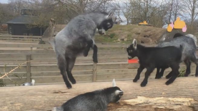 Noch so jung und schon so wild. Im Kopenhagener Zoo liefern sich junge Mini-Ziegen einen Schaukampf. Dass sie dabei auf einem Baumstamm balancieren, ist für die quirligen Kletterprofis offensichtlich kein Problem.