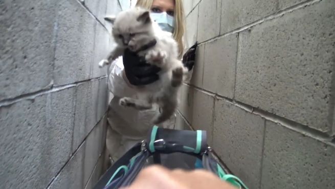 Die Tierrettung 'Hope For Paws' war zu einer Schutthalde gerufen worden, auf der Anwohner fünf junge Kätzchen gefunden hatten. Die Tiere saßen in einem schmalen Spalt fest, was die Bergung ziemlich schwierig machte. Zum Glück waren die Retter erfolgreich.