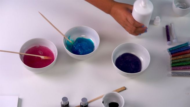 Mit wenigen Zutaten kannst du deinen eigenen kunterbunten Schleim produzieren. Glitzernden Glibber kann man doch immer gebrauchen.