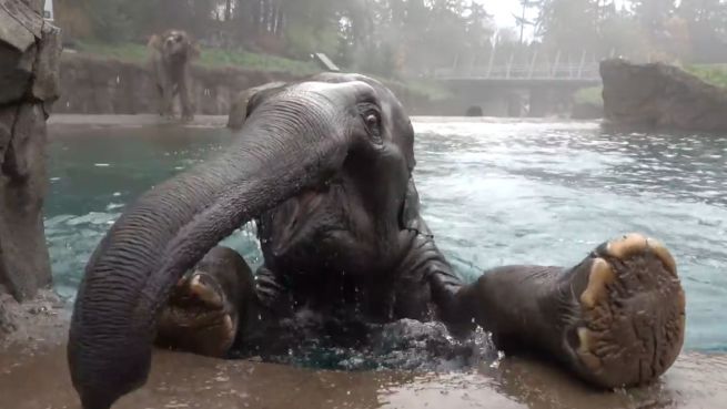 Sport für Äpfel: Elefantendame schwimmt für Leibspeise