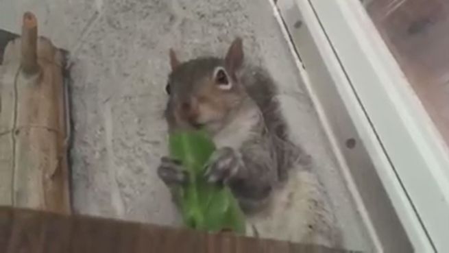 Grauhörnchen 'Squeaky' lebt im 'Orphaned Wildlife Center' und hat neuerdings eine besondere Vorliebe für Grünzeug. Hier futtert sie sich fröhlich durch die gesunde Gemüseküche.