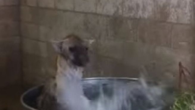 Im Oakland Zoo genehmigt sich die Fleckenhyäne Harley ein kühles Bad und hat dabei sichtlich Spaß. Zumindest macht sie den Anschein, als bekomme sie gar nicht genug vom kühlen Nass.